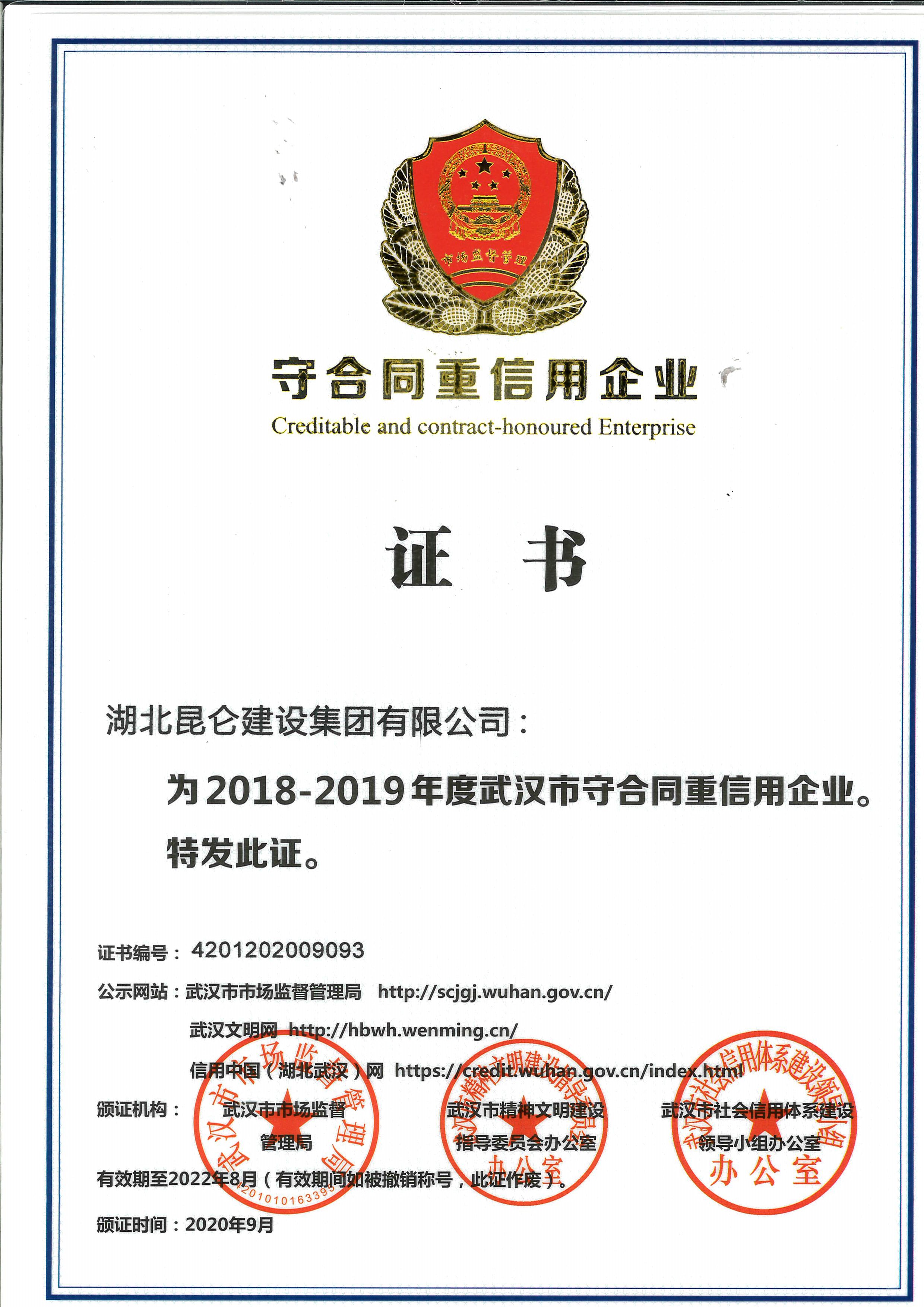 2018~2019年武汉市守合同重信用企业