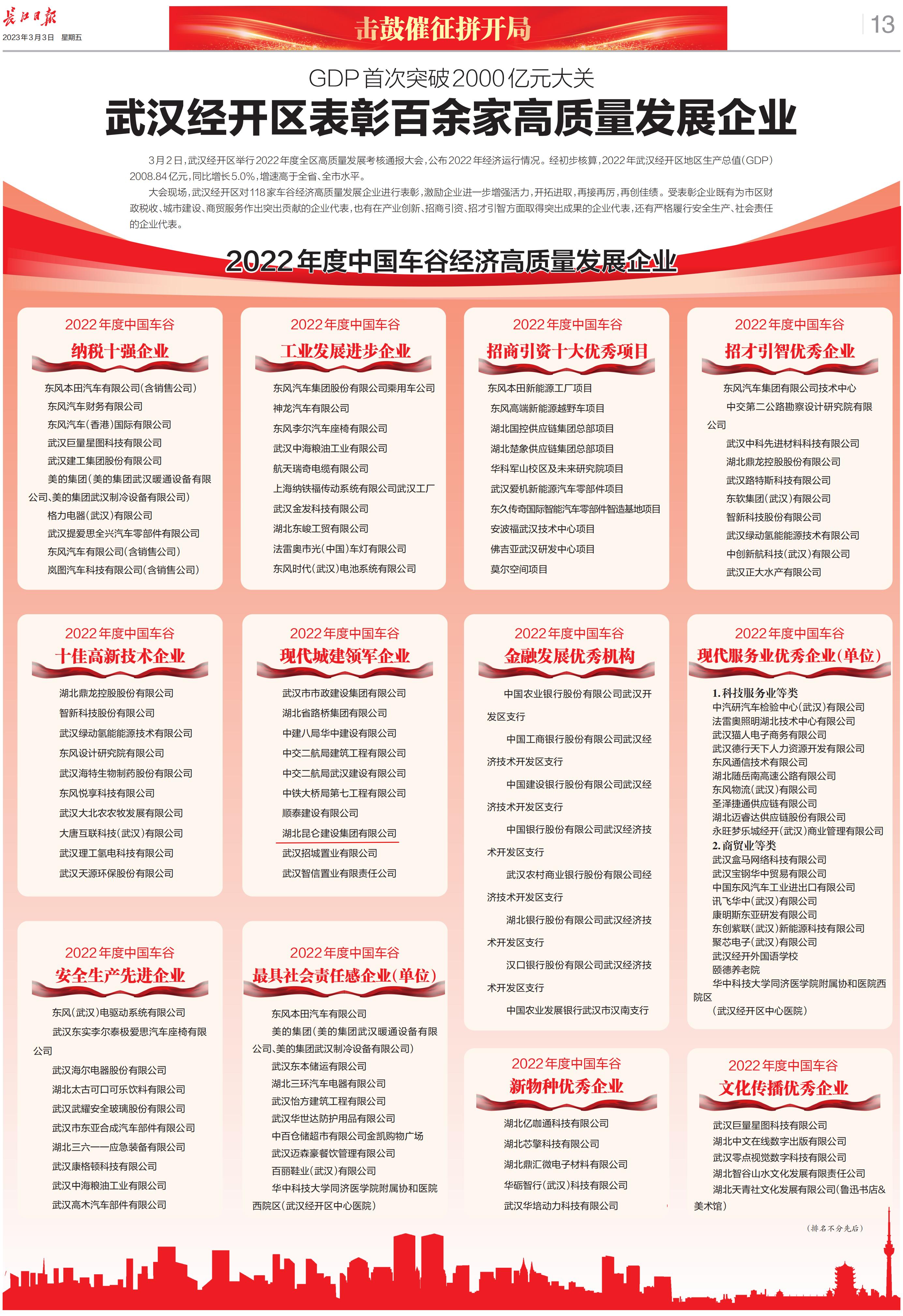 2022年昆仑集团荣登武汉经开区高质量发展企业(...